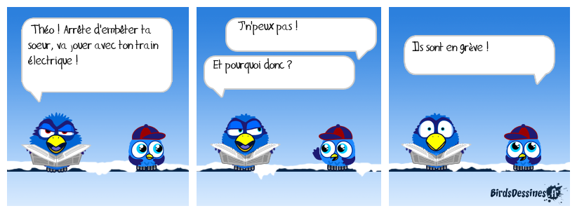 Case 1:Bird 1: Théo ! Arrête d'embêter ta soeur, va jouer avec ton train électrique ! | Case 2: Bird 1: J'n'peux pas ! Bird 2: Et pourquoi donc ? | Case 3: Bird 1: Ils sont en grève !