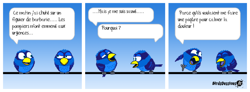 Case 1:Bird 1: Ce matin j'ai chuté sur un figuier de barbarie..... Les pompiers m'ont emmené aux urgences... | Case 2: Bird 1: ....Mais je me suis sauvé..... Bird 2: Pourquoi ? | Case 3: Bird 1: Parce qu'ils voulaient me faire une piqûre pour calmer la douleur !