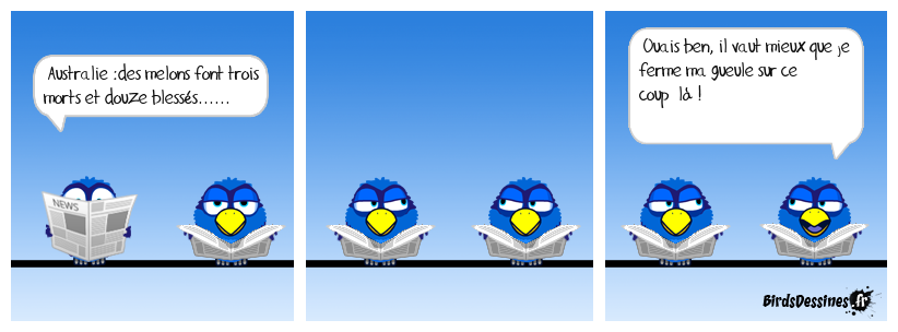 Case 1:Bird 1: Australie :des melons font trois morts et douze blessés...... | Case 2: | Case 3: Bird 1: Ouais ben, il vaut mieux que je ferme ma gueule sur ce coup là !