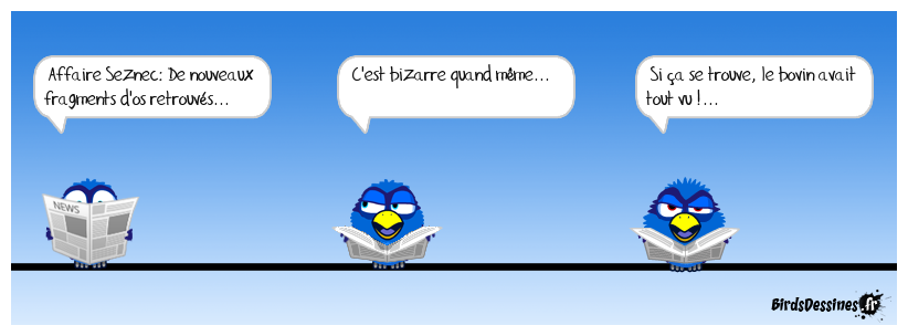 Case 1:Bird 1: Affaire Seznec: De nouveaux fragments d'os retrouvés... | Case 2: Bird 1: C'est bizarre quand même... | Case 3: Bird 1: Si ça se trouve, le bovin avait tout vu !...