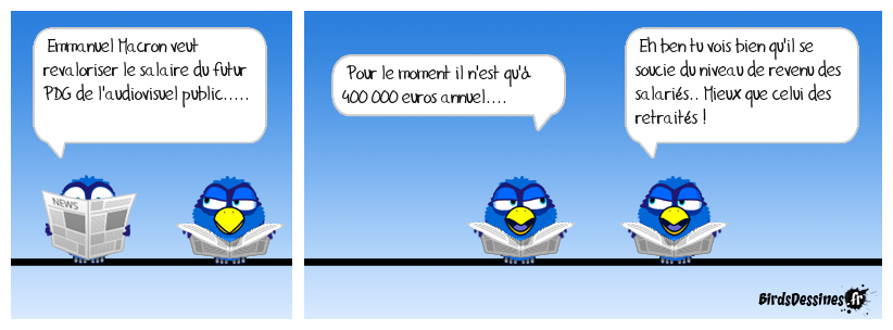 Case 1:Bird 1: Emmanuel Macron veut revaloriser le salaire du futur PDG de l'audiovisuel public..... | Case 2: Bird 1: Pour le moment il n'est qu'à 400 000 euros annuel.... | Case 3: Bird 1: Eh ben tu vois bien qu'il se soucie du niveau de revenu des salariés.. Mieux que celui des retraités !