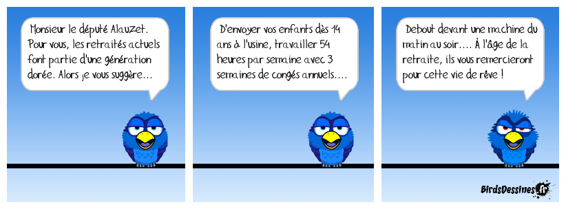 Case 1:Bird 1: Monsieur le député Alauzet. Pour vous, les retraités actuels font partie d'une génération dorée. Alors je vous suggère... | Case 2: Bird 1: D'envoyer vos enfants dès 14 ans à l'usine, travailler 54 heures par semaine avec 3 semaines de congés annuels.... | Case 3: Bird 1: Debout devant une machine du matin au soir.... À l'âge de la retraite, ils vous remercieront pour cette vie de rêve !