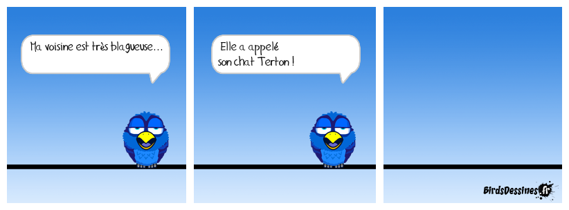 Case 1:Bird 1: Ma voisine est très blagueuse... | Case 2: Bird 1: Elle a appelé son chat Terton ! | Case 3: