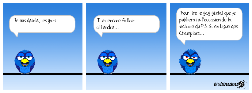 Case 1:Bird 1: Je suis désolé, les gars... | Case 2: Bird 1: Il va encore falloir attendre... | Case 3: Bird 1: Pour lire le gag génial que je publierai à l'occasion de la victoire du P.S.G. en Ligue des Champions...