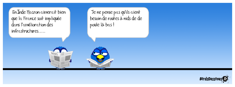 Case 1:Bird 1: En Inde Macron aimerait bien que la France soit impliquée dans l'amélioration des infrastructures..... | Case 2: Bird 1: Je ne pense pas qu'ils aient besoin de routes à nids de de poule là bas ! | Case 3: