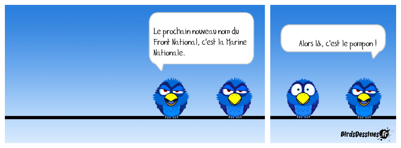 Case 1: | Case 2: Bird 1: Le prochain nouveau nom du Front National, c'est la Marine Nationale. | Case 3: Bird 1: Alors là, c'est le pompon !
