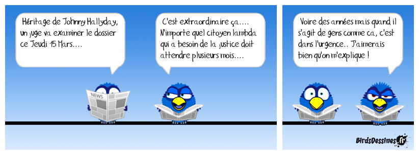 Case 1:Bird 1: Héritage de Johnny Hallyday, un juge va examiner le dossier ce Jeudi 15 Mars.... | Case 2: Bird 1: C'est extraordinaire ça.... N'importe quel citoyen lambda qui a besoin de la justice doit attendre plusieurs mois.... | Case 3: Bird 1: Voire des années mais quand il s'agit de gens comme ca, c'est dans l'urgence.. J'aimerais bien qu'on m'explique !