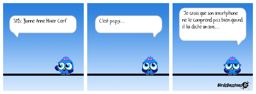 Case 1:Bird 1: SMS: Bonne Anne Hiver Cerf | Case 2: Bird 1: C'est papy... | Case 3: Bird 1: Je crois que son smartphone ne le comprend pas bien quand il lui dicte un sms...