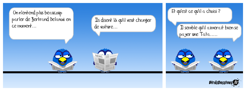 Case 1:Bird 1: On n'entend plus beaucoup parler de Bertrand Delanoë en ce moment... | Case 2: Bird 1: Ils disent là qu'il veut changer de voiture... | Case 3: Bird 1: Et qu'est ce qu'il a choisi ? Bird 2: Il semble qu'il aimerait bien se payer une Tata.....