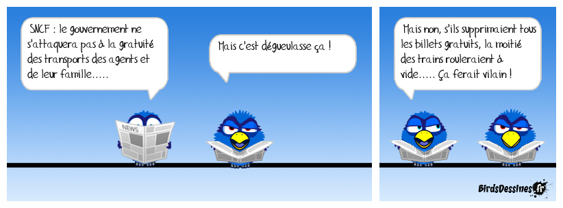 Case 1:Bird 1: SNCF : le gouvernement ne s'attaquera pas à la gratuité des transports des agents et de leur famille..... | Case 2: Bird 1: Mais c'est dégueulasse ça ! | Case 3: Bird 1: Mais non, s'ils supprimaient tous les billets gratuits, la moitié des trains rouleraient à vide..... Ça ferait vilain !