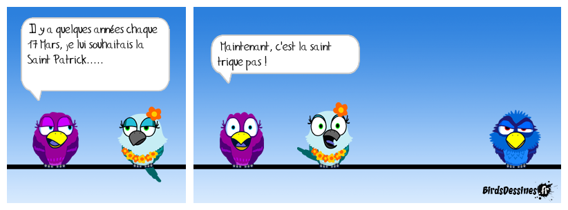 Case 1:Bird 1: Il y a quelques années chaque 17 Mars, je lui souhaitais la Saint Patrick..... | Case 2: Bird 1: Maintenant, c'est la saint trique pas ! | Case 3:
