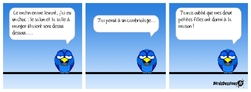 Case 1:Bird 1: Ce matin en me levant, j'ai eu un choc : le salon et la salle à manger étaient sens dessus dessous..... | Case 2: Bird 1: J'ai pensé à un cambriolage... | Case 3: Bird 1: J'avais oublié que mes deux petites filles ont dormi à la maison !