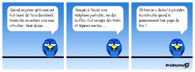 Case 1:Bird 1: Quand on pense qu'ils nous ont fait boire de l'eau du robinet, trimballés en voiture sans nous attacher, fumé dessus..... | Case 2: Bird 1: Envoyés à l'école sans téléphone portable, mis des baffes, fait manger des fruits et légumes non bio..... | Case 3: Bird 1: Eh ben on a du mal à plaindre les retraités quand le gouvernement leur pique du fric !