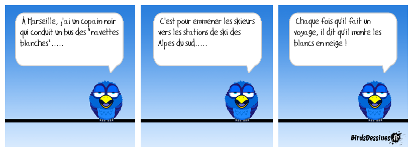 Case 1:Bird 1: À Marseille, j'ai un copain noir qui conduit un bus des "navettes blanches"..... | Case 2: Bird 1: C'est pour emmener les skieurs vers les stations de ski des Alpes du sud..... | Case 3: Bird 1: Chaque fois qu'il fait un voyage, il dit qu'il monte les blancs en neige !