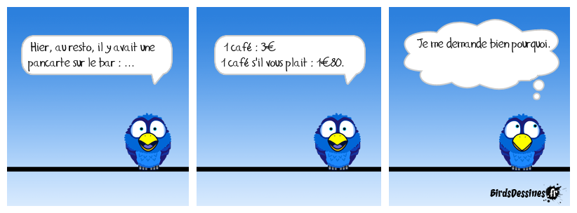 Case 1:Bird 1: Hier, au resto, il y avait une pancarte sur le bar : ... | Case 2: Bird 1: 1 café : 3€ 1 café s'il vous plait : 1€80. | Case 3: Bird 1: Je me demande bien pourquoi.