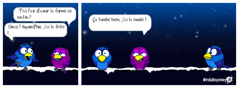 Case 1:Bird 1: T'as l'air d'avoir la forme ce matin ?Bird 2: Ouais ! Aujourd'hui, j'ai la frite ! | Case 2: Bird 1: Ça tombe bien, j'ai la moule ! | Case 3: