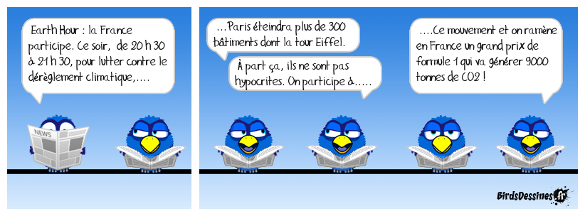 Case 1:Bird 1: Earth Hour : la France participe. Ce soir, de 20 h 30 à 21 h 30, pour lutter contre le dérèglement climatique,.... | Case 2: Bird 1: ...Paris éteindra plus de 300 bâtiments dont la tour Eiffel. Bird 2: À part ça, ils ne sont pas hypocrites. On participe à..... | Case 3: Bird 1: ....Ce mouvement et on ramène en France un grand prix de formule 1 qui va générer 9000 tonnes de CO2 !