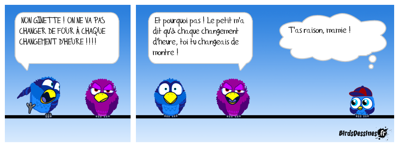 Case 1:Bird 1: NON GINETTE ! ON NE VA PAS CHANGER DE FOUR À CHAQUE CHANGEMENT D'HEURE !!!! | Case 2: Bird 1: Et pourquoi pas ! Le petit m'a dit qu'à chaque changement d'heure, toi tu changeais de montre ! | Case 3: Bird 1: T'as raison, mamie !