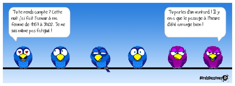 Case 1:Bird 1: Tu te rends compte ? Cette nuit j'ai fait l'amour à ma femme de 1h57 à 3h02. Je ne suis même pas fatigué ! | Case 2: | Case 3: Bird 1: Tu parles d'un vantard ! Il y en a que le passage à l'heure d'été arrange bien !