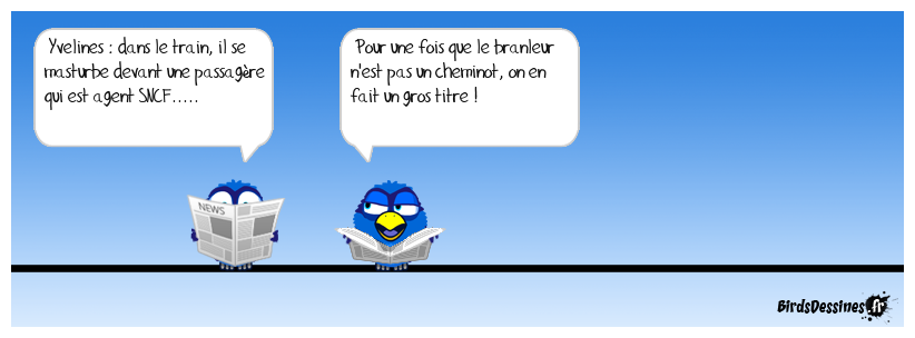 Case 1:Bird 1: Yvelines : dans le train, il se masturbe devant une passagère qui est agent SNCF..... | Case 2: Bird 1: Pour une fois que le branleur n'est pas un cheminot, on en fait un gros titre ! | Case 3: