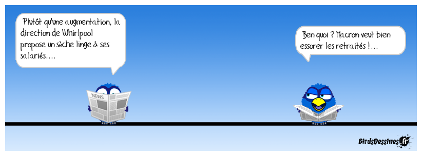 Case 1:Bird 1: Plutôt qu'une augmentation, la direction de Whirlpool propose un sèche linge à ses salariés.... | Case 2: | Case 3: Bird 1: Ben quoi ? Macron veut bien essorer les retraités !...