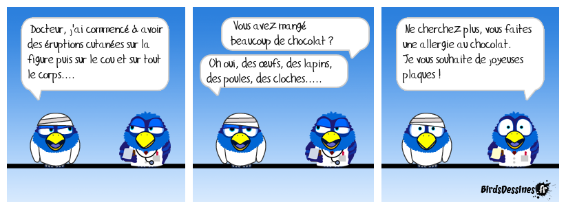 Case 1:Bird 1: Docteur, j'ai commencé à avoir des éruptions cutanées sur la figure puis sur le cou et sur tout le corps.... | Case 2: Bird 1: Vous avez mangé beaucoup de chocolat ? Bird 2: Oh oui, des œufs, des lapins, des poules, des cloches..... | Case 3: Bird 1: Ne cherchez plus, vous faites une allergie au chocolat. Je vous souhaite de joyeuses plaques !