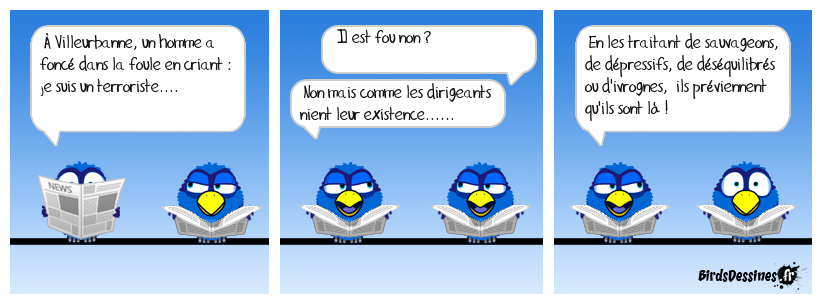 Case 1:Bird 1: À Villeurbanne, un homme a foncé dans la foule en criant : je suis un terroriste.... | Case 2: Bird 1: Il est fou non ? Bird 2: Non mais comme les dirigeants nient leur existence...... | Case 3: Bird 1: En les traitant de sauvageons, de dépressifs, de déséquilibrés ou d'ivrognes, ils préviennent qu'ils sont là !