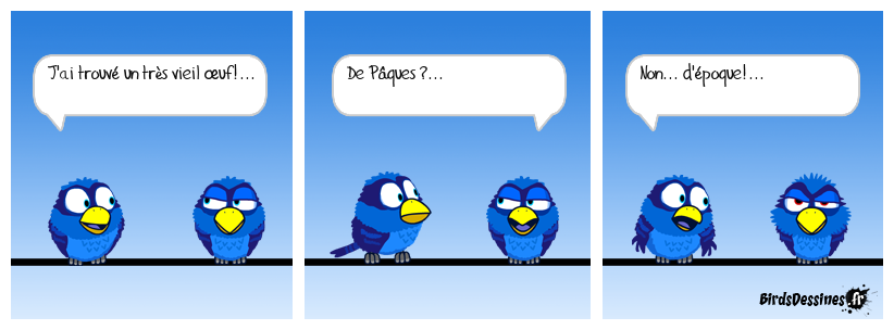 Case 1:Bird 1: J'ai trouvé un très vieil œuf!... | Case 2: Bird 1: De Pâques ?... | Case 3: Bird 1: Non... d'époque!...