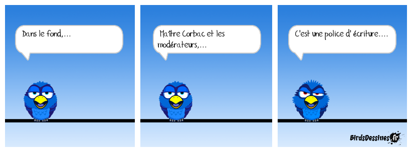 Case 1:Bird 1: Dans le fond,... | Case 2: Bird 1: Maïtre Corbac et les modérateurs,... | Case 3: Bird 1: C'est une police d' écriture....