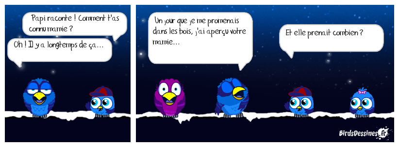 Case 1:Bird 1: Papi raconte ! Comment t'as connu mamie ?Bird 2: Oh ! Il y a longtemps de ça... | Case 2: Bird 1: Un jour que je me promenais dans les bois, j'ai aperçu votre mamie... | Case 3: Bird 1: Et elle prenait combien ?