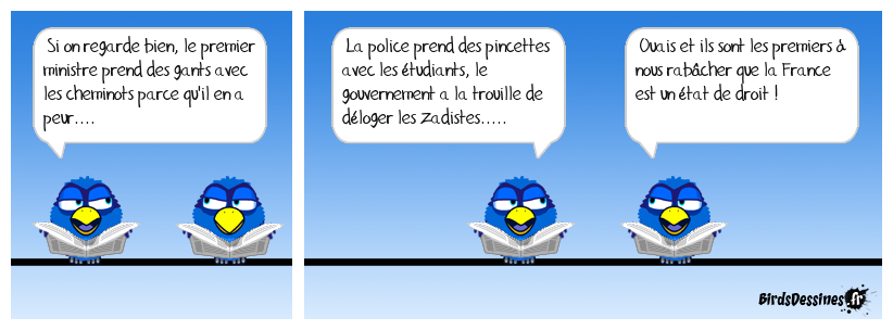 Case 1:Bird 1: Si on regarde bien, le premier ministre prend des gants avec les cheminots parce qu'il en a peur.... | Case 2: Bird 1: La police prend des pincettes avec les étudiants, le gouvernement a la trouille de déloger les zadistes..... | Case 3: Bird 1: Ouais et ils sont les premiers à nous rabâcher que la France est un état de droit !
