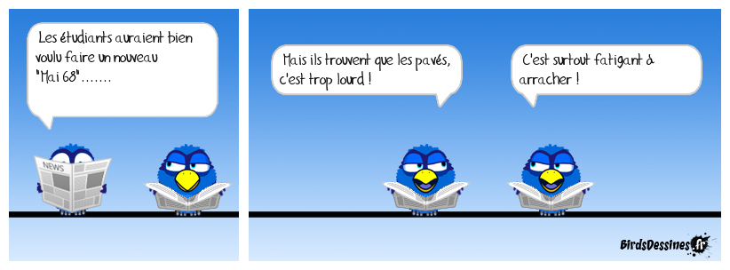 Case 1:Bird 1: Les étudiants auraient bien voulu faire un nouveau "Mai 68"....... | Case 2: Bird 1: Mais ils trouvent que les pavés, c'est trop lourd ! | Case 3: Bird 1: C'est surtout fatigant à arracher !