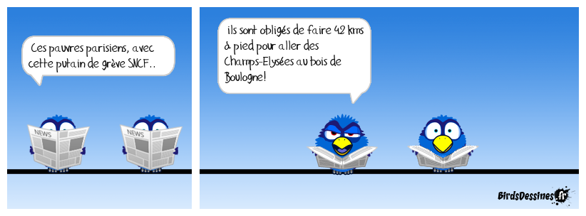 Case 1:Bird 1: Ces pauvres parisiens, avec cette putain de grève SNCF.. | Case 2: Bird 1: ils sont obligés de faire 42 kms à pied pour aller des Champs-Elysées au bois de Boulogne! | Case 3: