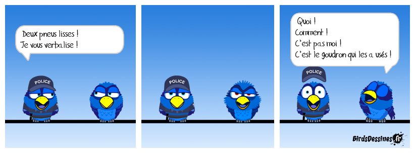 Case 1:Bird 1: Deux pneus lisses ! Je vous verbalise ! | Case 2: | Case 3: Bird 1: Quoi ! Comment ! C’est pas moi ! C’est le goudron qui les a usés !