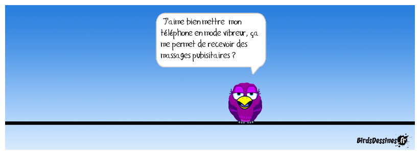 Case 1: | Case 2: Bird 1: J'aime bien mettre mon téléphone en mode vibreur, ça me permet de recevoir des massages pubisitaires ? | Case 3: