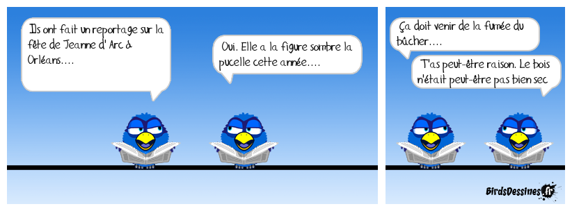 Case 1:Bird 1: Ils ont fait un reportage sur la fête de Jeanne d' Arc à Orléans.... | Case 2: Bird 1: Oui. Elle a la figure sombre la pucelle cette année.... | Case 3: Bird 1: Ça doit venir de la fumée du bûcher.... Bird 2: T'as peut-être raison. Le bois n'était peut-être pas bien sec