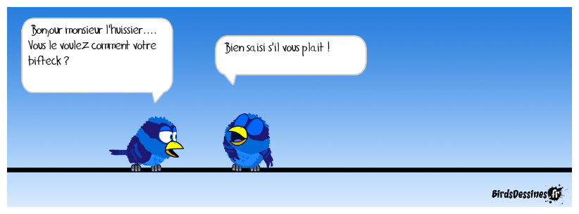 Case 1:Bird 1: Bonjour monsieur l'huissier.... Vous le voulez comment votre bifteck ? | Case 2: Bird 1: Bien saisi s'il vous plait ! | Case 3: