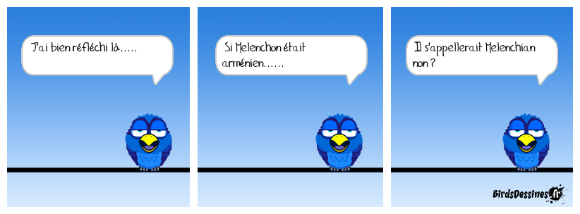 Case 1:Bird 1: J'ai bien réfléchi là..... | Case 2: Bird 1: Si Melenchon était arménien...... | Case 3: Bird 1: Il s'appellerait Melenchian non ?