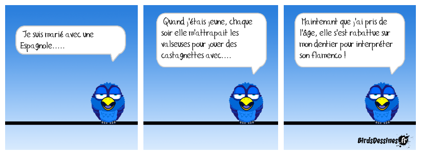 Case 1:Bird 1: Je suis marié avec une Espagnole..... | Case 2: Bird 1: Quand j'étais jeune, chaque soir elle m'attrapait les valseuses pour jouer des castagnettes avec.... | Case 3: Bird 1: Maintenant que j'ai pris de l'âge, elle s'est rabattue sur mon dentier pour interpréter son flamenco !