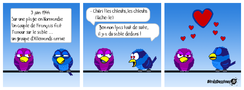 Case 1:Bird 1: 3 juin 1944 Sur une plage en Normandie Un couple de Français fait l'amour sur le sable ... un groupe d'Allemands arrive | Case 2: Bird 1: - Chéri !les chleuhs,les chleuhs (lèche-le) Bird 2: Ben non !pas tout de suite, il y a du sable dedans ! | Case 3: