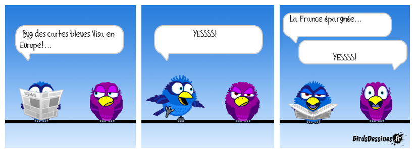 Case 1:Bird 1: Bug des cartes bleues Visa en Europe!... | Case 2: Bird 1: YESSSS! | Case 3: Bird 1: La France épargnée... Bird 2: YESSSS!