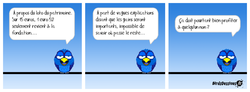 Case 1:Bird 1: À propos du loto du patrimoine. Sur 15 euros, 1 euro 52 seulement revient à la fondation.... | Case 2: Bird 1: À part de vagues explications disant que les gains seront importants, impossible de savoir où passe le reste... | Case 3: Bird 1: Ça doit pourtant bien profiter à quelqu'un non ?
