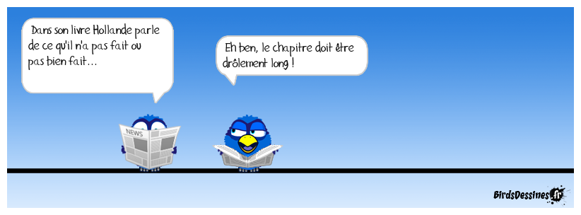 Case 1:Bird 1: Dans son livre Hollande parle de ce qu'il n'a pas fait ou pas bien fait... | Case 2: Bird 1: Eh ben, le chapitre doit être drôlement long ! | Case 3: