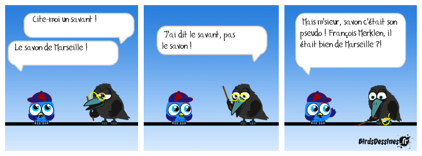 Case 1:Bird 1: Cite-moi un savant !Bird 2: Le savon de Marseille ! | Case 2: Bird 1: J'ai dit le savant, pas le savon ! | Case 3: Bird 1: Mais m'sieur, savon c'était son pseudo ! François Merklen, il était bien de Marseille ?!