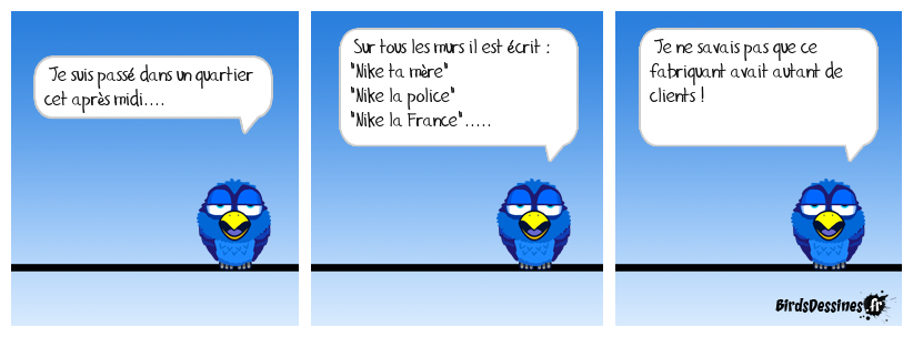 Case 1:Bird 1: Je suis passé dans un quartier cet après midi.... | Case 2: Bird 1: Sur tous les murs il est écrit : "Nike ta mère" "Nike la police" "Nike la France"..... | Case 3: Bird 1: Je ne savais pas que ce fabriquant avait autant de clients !
