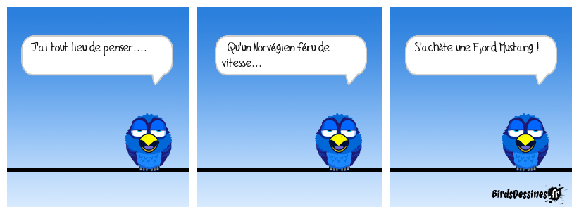 Case 1:Bird 1: J'ai tout lieu de penser.... | Case 2: Bird 1: Qu'un Norvégien féru de vitesse... | Case 3: Bird 1: S'achète une Fjord Mustang !