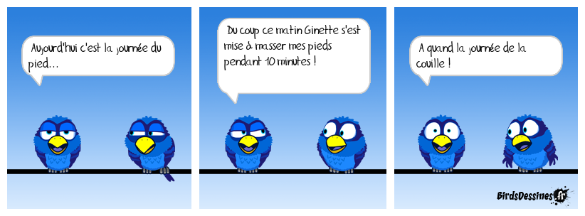 Case 1:Bird 1: Aujourd'hui c'est la journée du pied... | Case 2: Bird 1: Du coup ce matin Ginette s'est mise à masser mes pieds pendant 10 minutes ! | Case 3: Bird 1: A quand la journée de la couille !