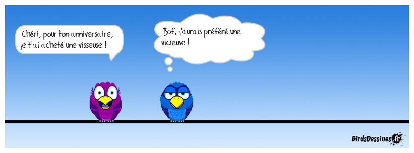 Case 1:Bird 1: Chéri, pour ton anniversaire, je t'ai acheté une visseuse ! | Case 2: Bird 1: Bof, j'aurais préféré une vicieuse ! | Case 3: