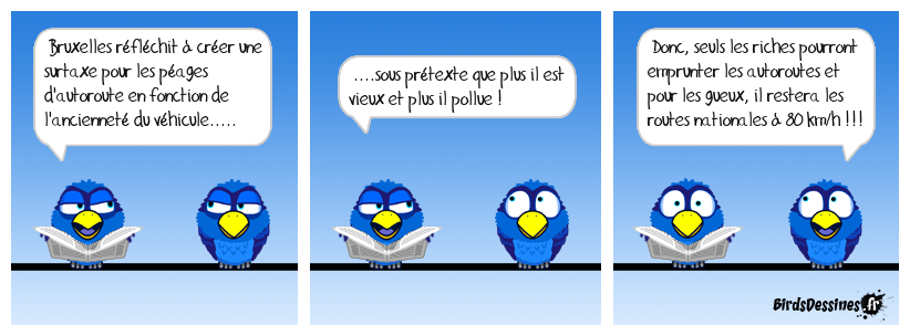Case 1:Bird 1: Bruxelles réfléchit à créer une surtaxe pour les péages d'autoroute en fonction de l'ancienneté du véhicule..... | Case 2: Bird 1: ....sous prétexte que plus il est vieux et plus il pollue ! | Case 3: Bird 1: Donc, seuls les riches pourront emprunter les autoroutes et pour les gueux, il restera les routes nationales à 80 km/h !!!