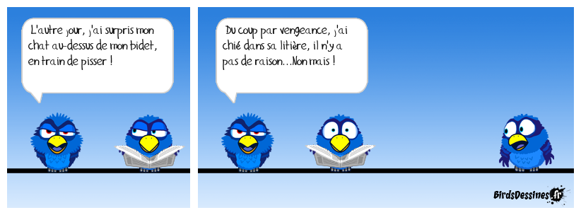 Case 1:Bird 1: L'autre jour, j'ai surpris mon chat au-dessus de mon bidet, en train de pisser ! | Case 2: Bird 1: Du coup par vengeance, j'ai chié dans sa litière, il n'y a pas de raison...Non mais ! | Case 3: